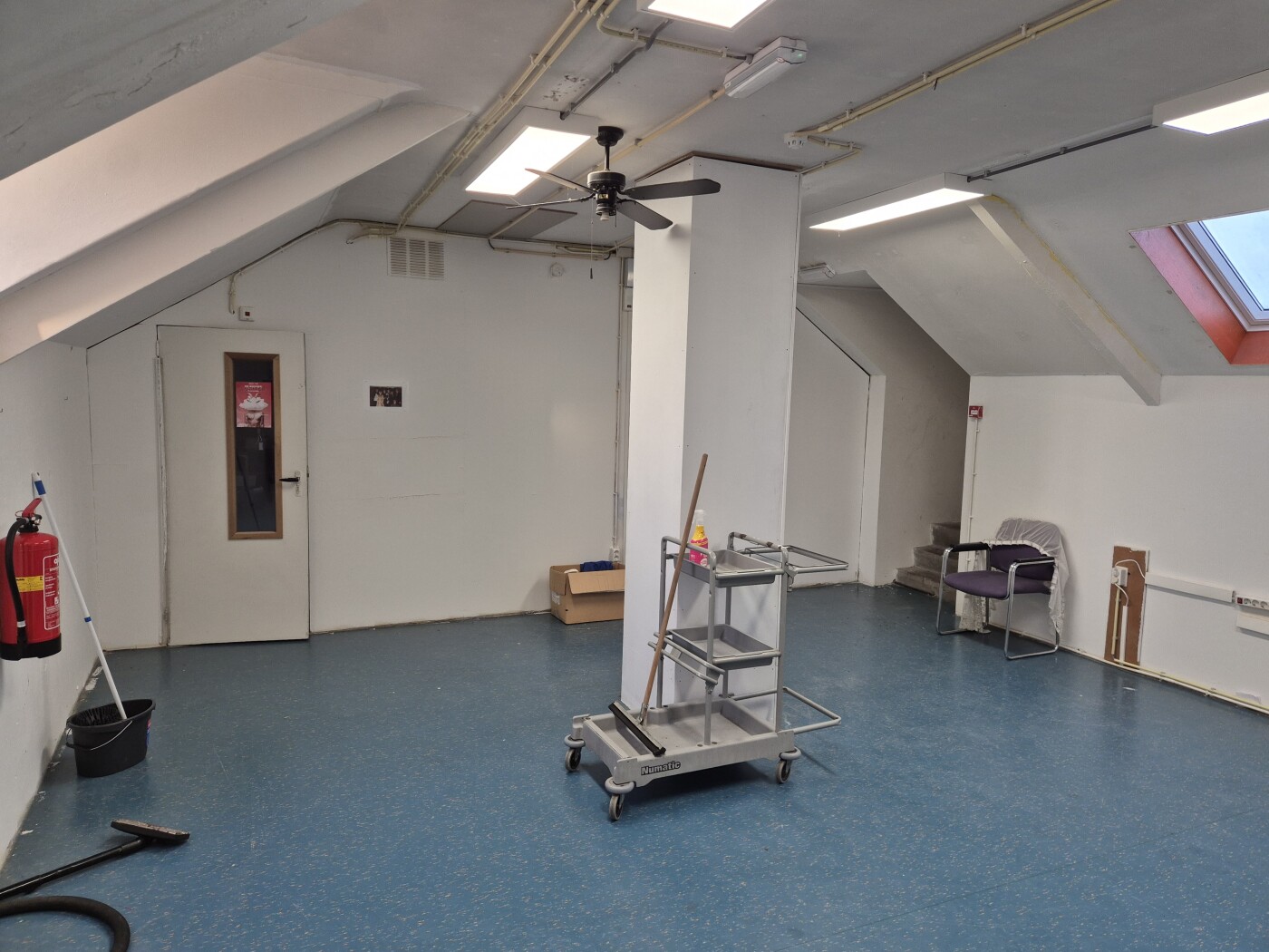 Op de tweede verdieping is een ruimte te huur van 6,5 bij 6,5 m (42,25 m2). Deze ruimte is niet geschikt voor activiteiten die veel geluid maken ( in de avonduren) vanwege de ruimtes die er onder zitten.